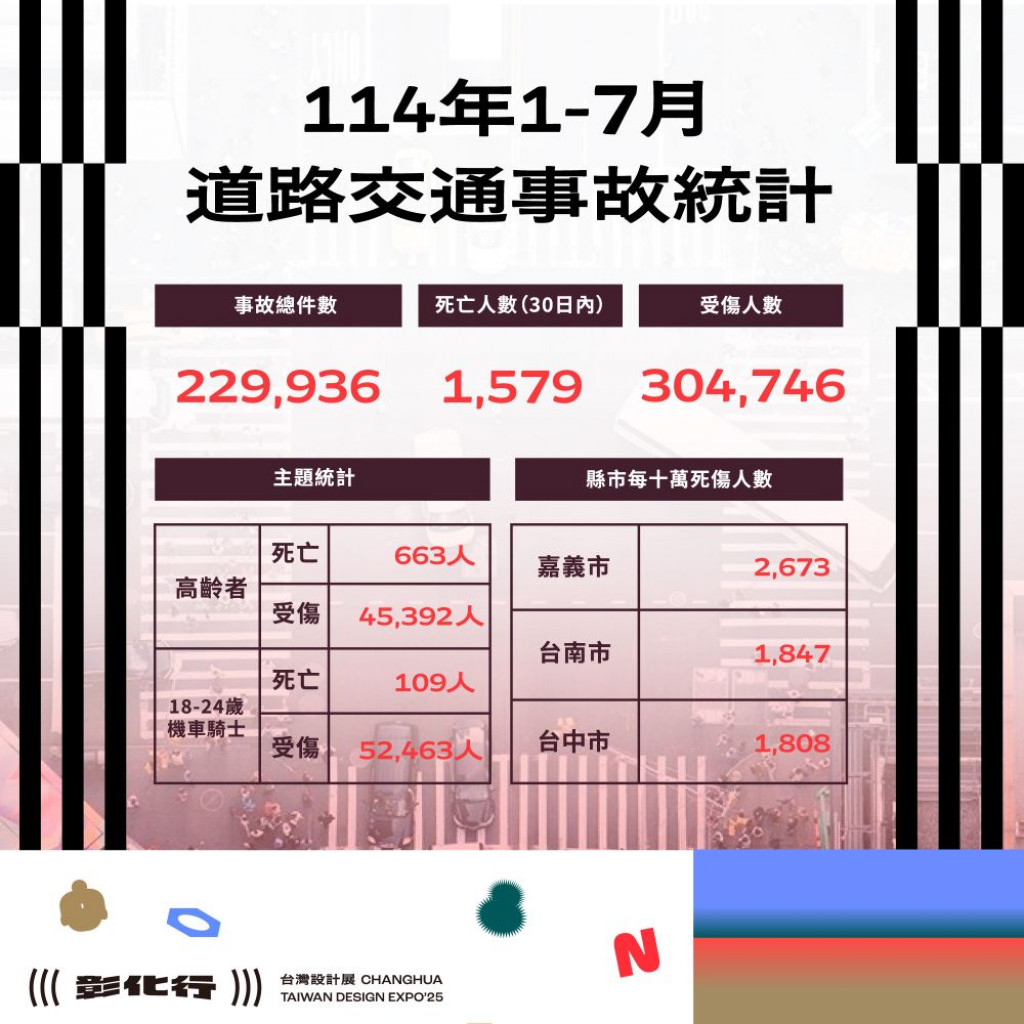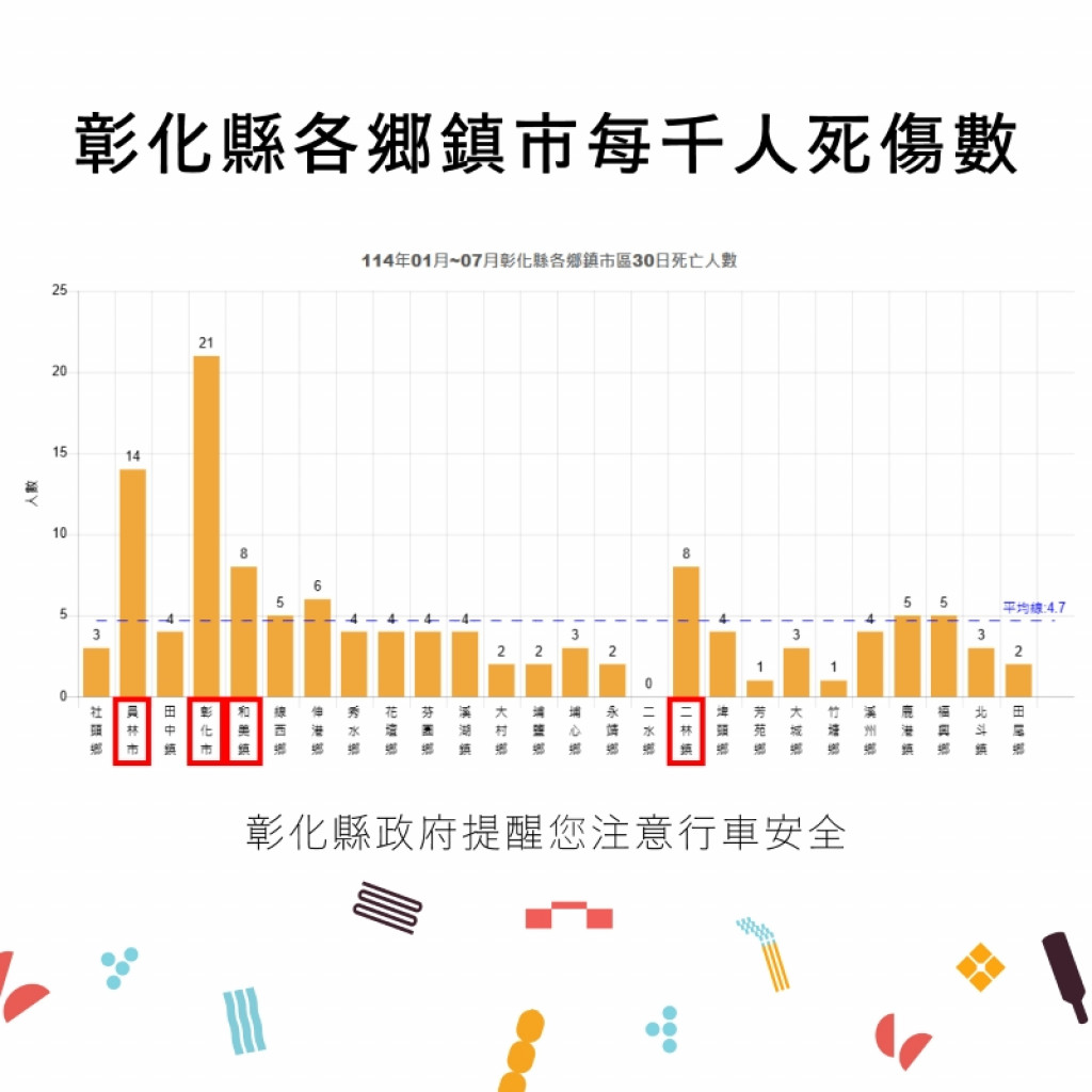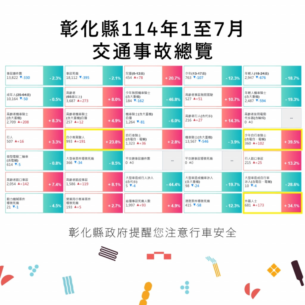 | 二、 | 根據交通部道安資訊查詢網統計快覽數據跟112年同期比較分析,以少年自行車騎士(含電自、電輔) 事故增加39.5%最高,外籍人士事故增加34.1%次之,自小客車駕駛人增加23.8%再次之。1-7月份30日鄉鎮市每千人死傷人數於「彰化市、員林市、二林鎮、和美鎮」為多,肇事熱點以「彰化市」為多,合先敘明。 |