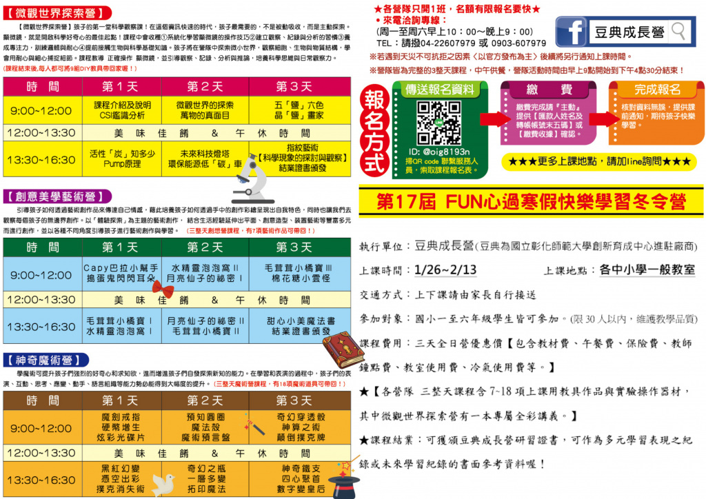 | 一、 | 旨揭寒期活動分為微觀世界探索營、創意美學藝術營、神奇魔術營三項,歡迎貴校學生踴躍報名參加。 |