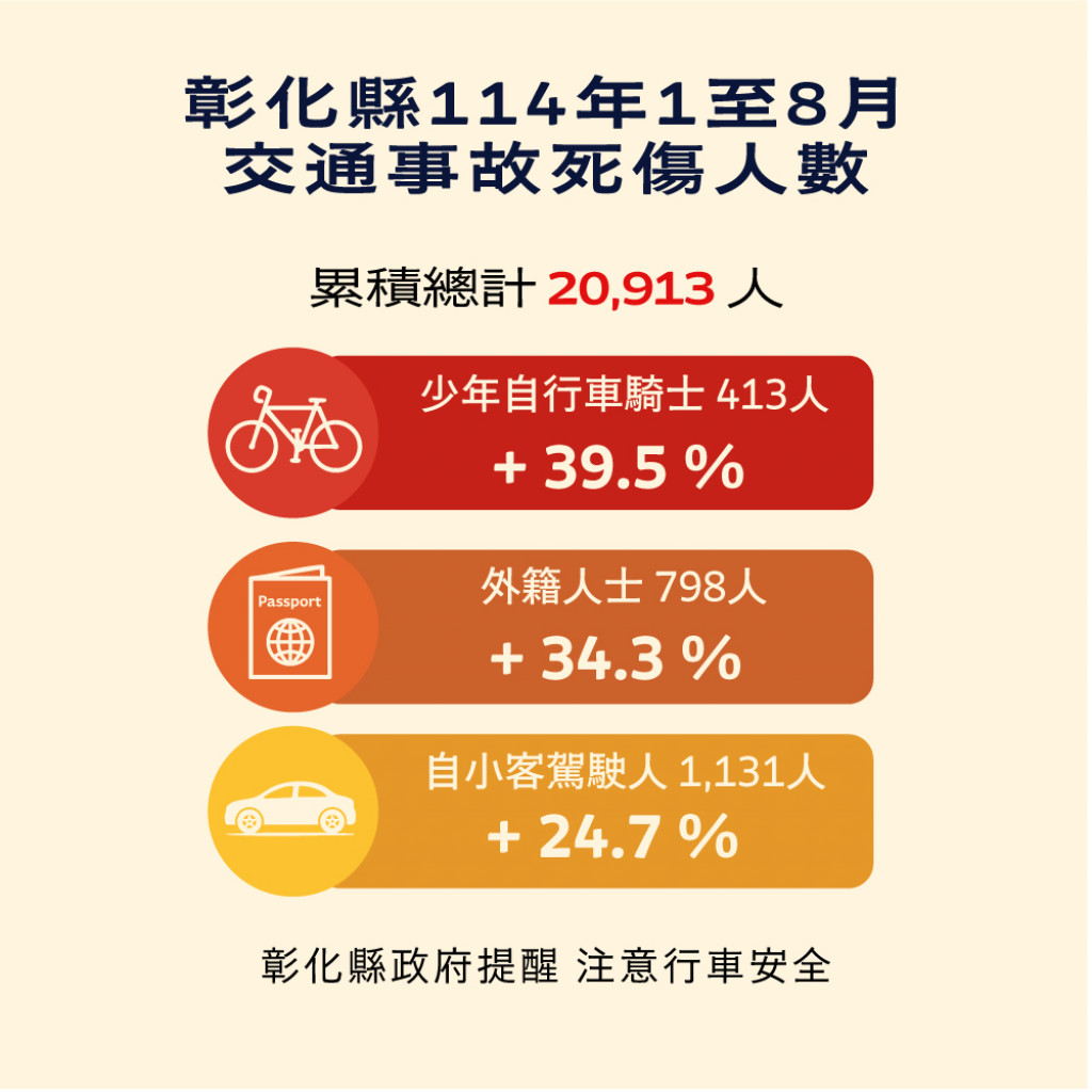 | 二、 | 根據交通部道安資訊查詢網,本縣114年1-8月道路交通事故與112年同期比較分析,以少年自行車騎士(含電自、電輔) 事故增加39.5%最高,外籍人士事故增加34.3%次之,自小客車駕駛人增加24.7%再次之。1-8月份30日鄉鎮市每千人死傷人數於「彰化市、員林市、二林鎮」為多,肇事熱點以「彰化市」為多。 |