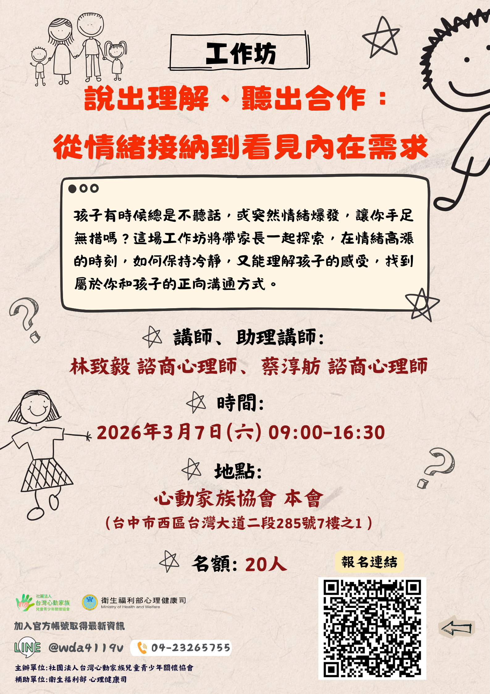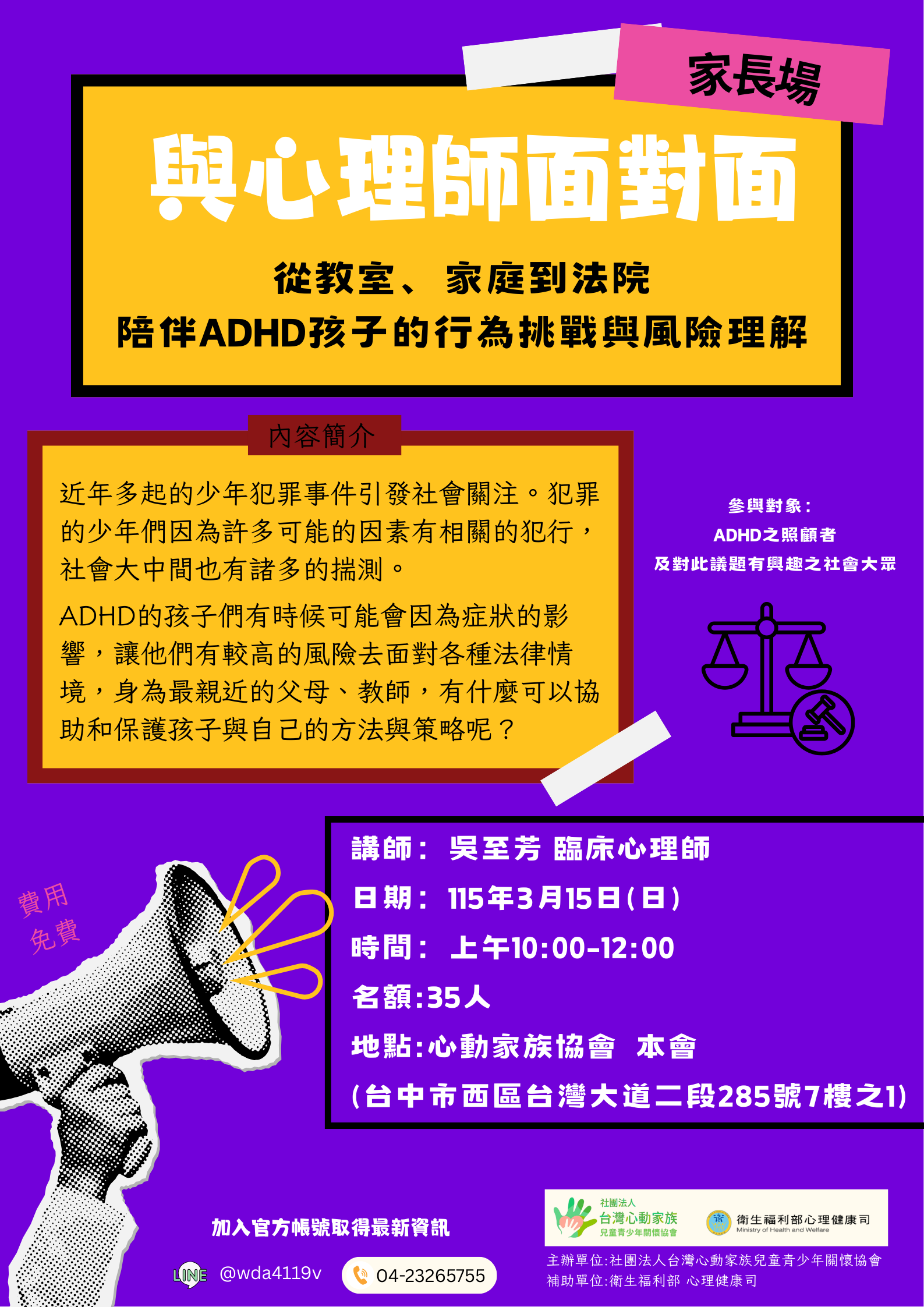 社團法人台灣心動家族兒童青少年關懷協會「115年03月 ADHD 相關主題講座及工作坊」海報,針對注意力不足過動症(ADHD)兒童青少年之心理健康與人際適應議題,規劃辦理一系列免費之教師研習及家長教育活動