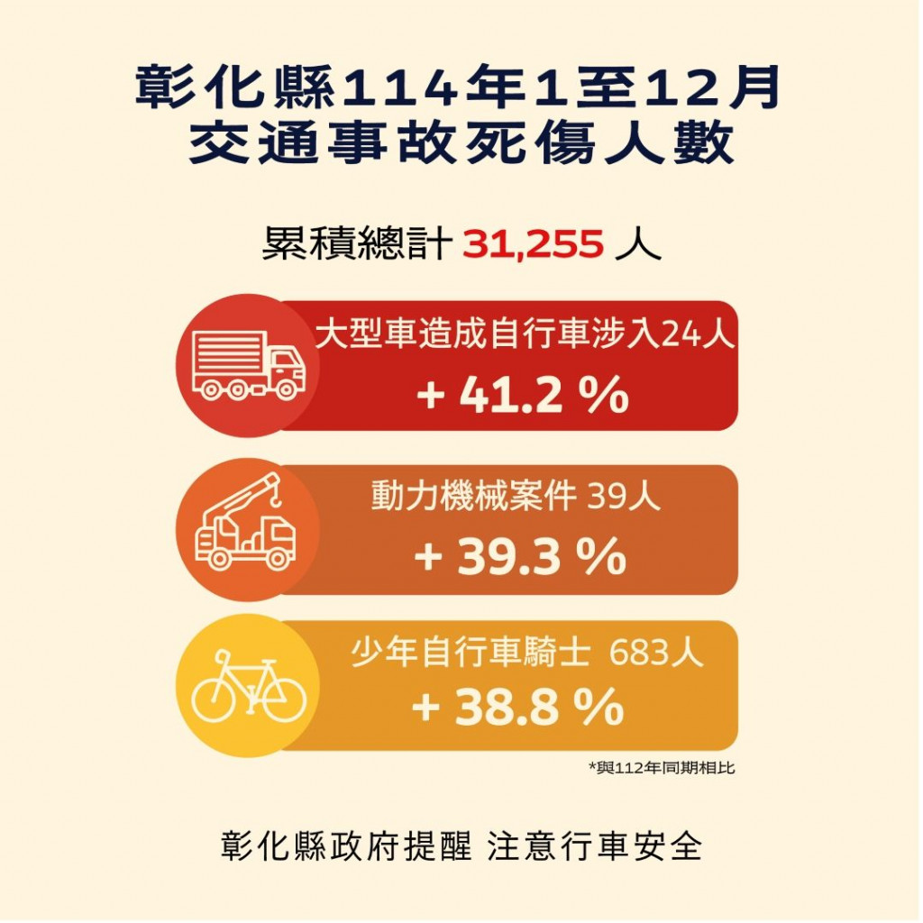 | 二、 | 根據交通部道安資訊查詢網,彰化縣114年1-12月道路交通事故與112年同期比較分析,以大型車造成自行車涉入(含電自、電輔)事故增加41.2%最高, 動力機械案件 增加39.3%次之。少年自行車騎士(含電自、電輔) 增加38.8%再次之。1-12月份鄉鎮市30日死亡人數於「彰化市、員林市、鹿港鎮」為多,肇事熱點以「彰化市」為多,合先敘明。 |